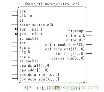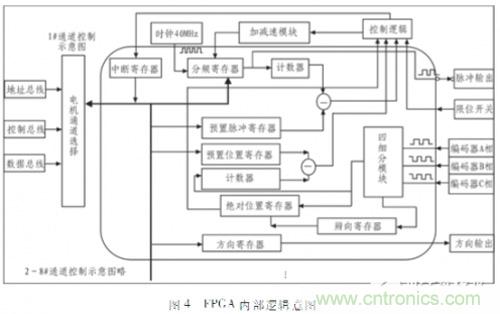 專(zhuān)用控制器在完成整個(gè)控制的過(guò)程中,arm只負(fù)責(zé)指令解析、控制指令發(fā)送、實(shí)時(shí)數(shù)據(jù)上傳等任務(wù),fpga才是多軸專(zhuān)用控制器的核心。通過(guò)Verilog HDL語(yǔ)言在fpga內(nèi)部實(shí)現(xiàn)了加減速曲線、編碼器信號(hào)辯向及四細(xì)分、絕對(duì)位移記錄等功能。圖3為電機(jī)控制的整體輸入、輸出信號(hào)圖,通過(guò)片選信號(hào)CS、讀有效信號(hào)rd_enable、寫(xiě)有效圖信號(hào)wr_enable進(jìn)行電機(jī)通道選擇。圖4給出了1#通道控制的fpga內(nèi)部邏輯示意圖,下面將逐一對(duì)各主要模塊進(jìn)行詳細(xì)介紹。