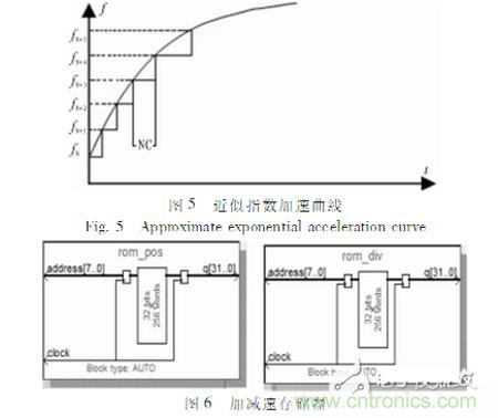 為了更有效、更理想地控制電機(jī)的運(yùn)行,在fpga內(nèi)部設(shè)計(jì)了加減速曲線模塊。文中采用了一種近似指數(shù)加減速曲線的方法,如圖5為近似指數(shù)加速曲線,減速曲線與之對(duì)稱(chēng)。速度等距分布,那么在該速度級(jí)上保持的時(shí)間不一樣場(chǎng)。為了簡(jiǎn)化,用速度級(jí)數(shù)N與一個(gè)常數(shù)C的乘積去模擬并且保持的時(shí)間用不熟來(lái)代替。因此,速度每升一級(jí),電機(jī)都要在該速度級(jí)上走NC步(其中N為該速度級(jí)數(shù))。