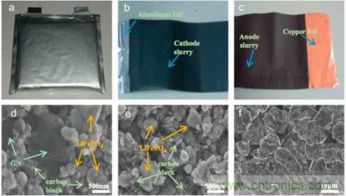 實驗中楊全紅的團隊制作了兩種電池,一種是普通的對照組電池,使用了7%的炭黑和3%的導電石墨,實驗組則使用1%的石墨烯和1%炭黑作為導電劑。試驗結果顯示,在相同的涂布量的前提下,使用石墨烯的實驗組電池容量(0.5C充放電)要明顯高于對照組電池,并且兩者的循環(huán)性能接近,表明石墨烯能夠搭建起更為高效的導電網(wǎng)絡,從而減少導電劑的用量,提高鋰離子電池的容量(10%),降低電池的極化,提升電池的能量密度。