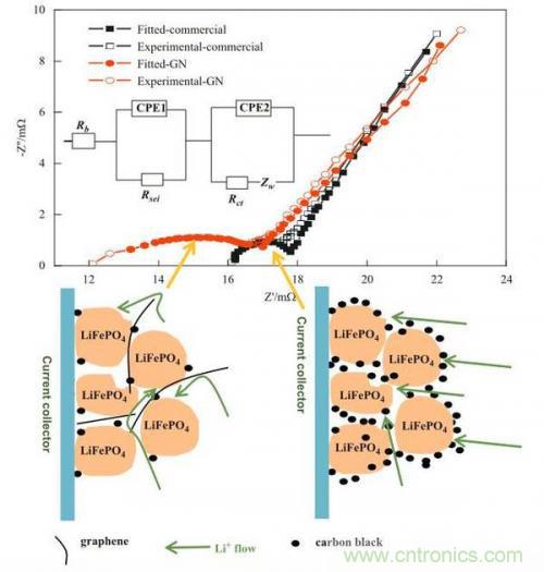 EIS分析顯示,添加石墨烯的實驗組電池的歐姆阻抗要明顯低于對照組電池,這主要得益于石墨烯的片狀結構能夠于活性物質顆粒形成很好的接觸,降低接觸電阻,但是在高頻段的電荷交換阻抗,實驗組電池要明顯高于對照組電池,這表明石墨烯的加入影響了Li+在電極內的擴散。仿真結果顯示,主要是由于石墨烯的片狀結構對Li+的擴散形成了阻礙,導致Li+的擴撒路徑延長,從而造成了添加石墨烯的鋰離子電池在大電流下極化增加,導致電池的放電容量下降。而傳統(tǒng)的炭黑、導電碳纖維和導電石墨等材料,由于橫截面較小,因此對Li+的擴散阻礙較小,對鋰離子電池大電流放電性能影響不大。