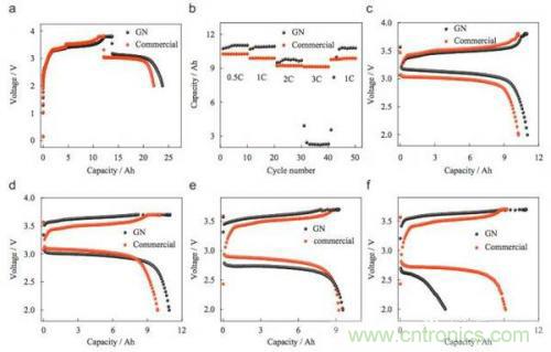 在隨后的倍率實驗中發(fā)現(xiàn),在0.5C、1C和2C的充放電倍率下,實驗組的石墨烯導電劑電池相比于對照組電池都表出了更高的容量和更小的極化,但是當充放電倍率提高到3C時,實驗組電池容量迅速下降到4Ah以下,而對照組電池的容量仍然保持在9Ah左右,繼續(xù)將放電倍率提高到4C,實驗組石墨烯導電劑電池由于極化太大,已經無法放電,而對照組電池則相對穩(wěn)定。