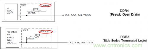 驅(qū)動DRAM工業(yè)發(fā)展的一個主要市場需求是對內(nèi)存器件的低功耗要求。介于這個原因,DDR4引入了一個新的IO驅(qū)動標準,成為PSOD(Pseudo Open Drain)。在PSOD里,接收端將信號端接到軌電壓(VDD),而不是軌電壓的一半(VDD/2)。