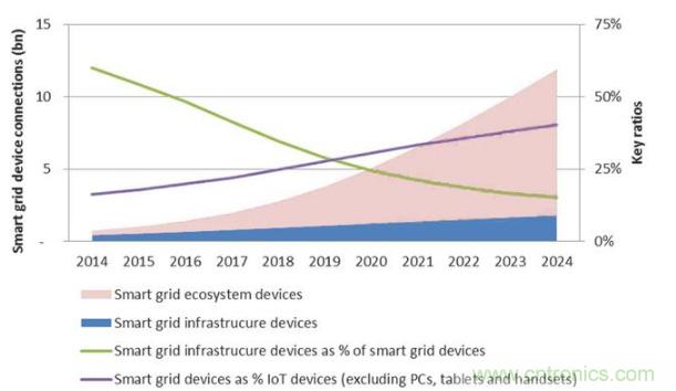 這些數(shù)字有三個明確的信息。首先,物聯(lián)網(wǎng)智能電網(wǎng)中包括的設備總量預計將迅速增長,從今天的不到10億而2024年增加將達到120億。第二,也許不奇怪的是,在依賴于智能電網(wǎng)功能的設備之前,將采用與智能電網(wǎng)基礎設施相關(guān)的設備。第三,與智能電網(wǎng)相關(guān)的設備將占據(jù)連接設備的越來越多的份額。這些預測顯示,到2024年,預計所有物聯(lián)網(wǎng)設備云連接(不包括PC,平板電腦和手機)的40%以上屬于智能電網(wǎng)生態(tài)系統(tǒng),將智能電網(wǎng)和VPP概念牢固地置于物聯(lián)網(wǎng)(IoT)的核心之中。