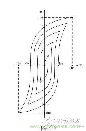如果再使H逐漸退到零,則與此同時B也逐漸減少。然而H和B對應(yīng)的曲線軌跡并不沿原曲線軌跡a-0返回,而是沿另一曲線下降到Br,這說明當H下降為零時,鐵磁物質(zhì)中仍保留一定的磁性,這種現(xiàn)象稱為磁滯,Br稱為剩磁。將磁場反向,再逐漸增加其強度,直到H=-Hc,磁通密度消失,這說明要消除剩磁,必須施加反向磁場Hc。Hc稱為矯頑力。它的大小反映鐵磁材料保持剩磁狀態(tài)的能力。圖2-16表明,當磁場按Hm→0→-Hc→-Hm→0→Hc→Hm次序變化時,B所經(jīng)歷的相應(yīng)變化為Bm→Br→0→-Bm→-Br→0→Bm。于是得到一條閉合的B~H曲線,稱為磁滯回線。所以,當鐵磁材料處于交變磁場中時(如變壓器中的鐵芯),它將沿磁滯回線反復(fù)被磁化→去磁→反向磁化→反向去磁。在此過程中要消耗額外的能量,并以熱的形式從鐵磁材料中釋放,這種損耗稱為磁滯損耗。前面已經(jīng)證明,磁滯損耗與磁滯回線所圍面積成正比。