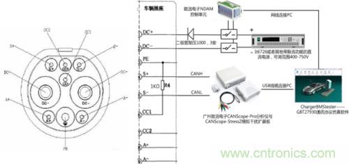 · K5、K6控制單元:驅(qū)動(dòng)上述繼電器,與協(xié)議模擬器配合,在充電過(guò)程進(jìn)入充電配置階段時(shí)實(shí)現(xiàn)繼電器吸合,進(jìn)而使充電樁檢測(cè)到模擬電池電壓。本文推薦選擇致遠(yuǎn)電子的NDAM-9000與NDAM-2808組成的控制單元,可以通過(guò)網(wǎng)口與CANScope實(shí)現(xiàn)聯(lián)動(dòng)。