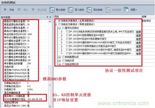 · 啟動(dòng)CANScope對(duì)應(yīng)的充電樁協(xié)議一致性測(cè)試軟件ChargerBMS_Tester,選擇BMS仿真測(cè)試,配置相應(yīng)信息主要包括模擬的BMS參數(shù)、K5、K6控制單元使能及IP地址設(shè)置。
