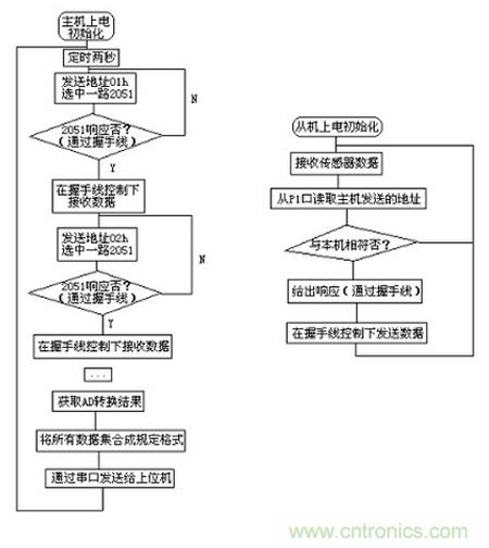 系統(tǒng)中51單片機作為主機控制著整個系統(tǒng)的動作并發(fā)起每次通信,每塊2051作為實時從傳感器獲取數(shù)據(jù)并在主機控制下完成通信。主機和各從機之間通過并口連接通信。主從機工作流程如下: