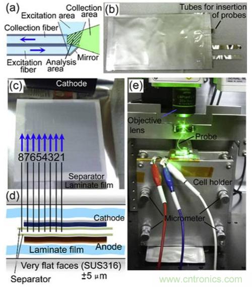 實(shí)驗(yàn)中Toshiro Yamanaka采用了方形疊片電池作為研究對(duì)象,電解液則采用了EC和DEC溶劑,LiClO4作為電解質(zhì)鹽,為了能夠?qū)﹄娦緝?nèi)部電解液的行為進(jìn)行實(shí)時(shí)觀測(cè),Toshiro Yamanaka在疊片鋰離子電池內(nèi)部引入了8根光纖作為拉曼光譜的探測(cè)器,研究電解液在電池內(nèi)的浸潤(rùn)和離子濃度的變化情況,8根光纖在電池內(nèi)的排布如下圖c所示: