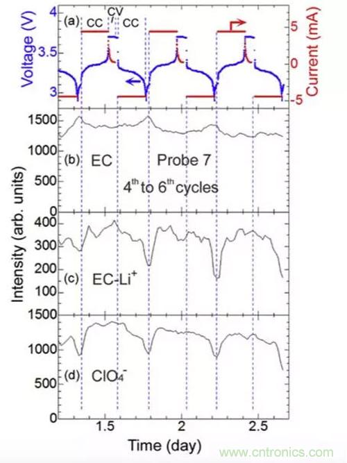 受限于技術(shù)手段,以往我們對(duì)于在充放電過程中電解液在鋰離子電池內(nèi)部的行為缺少直觀的認(rèn)識(shí),更像是研究一個(gè)黑箱,我們提出各種理論,對(duì)起行為進(jìn)行推測(cè)。為了更加形象和直觀的研究電解液在鋰離子電池內(nèi)的行為特點(diǎn),日本京都大學(xué)的Toshiro Yamanaka等[2]利用拉曼光譜