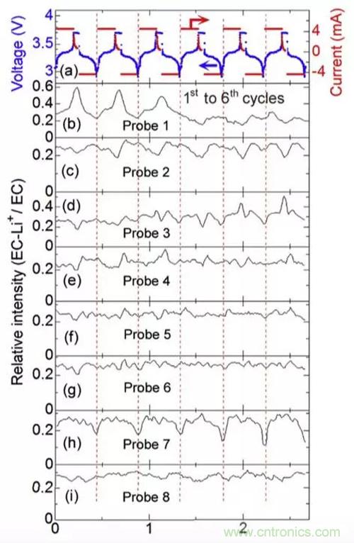 在研究Li+濃度的變化過程中,Toshiro Yamanaka還發(fā)現(xiàn)電解液的分布也隨著充放電而發(fā)生變化。下圖是在充放電過程中不同位置溶劑EC的強(qiáng)度的變化趨勢(shì),EC的強(qiáng)度變化主要反映該處電解液的數(shù)量多少,隨著電芯的體積變化,電芯內(nèi)的電解液分布也在不斷的發(fā)生著變化。例如在1號(hào)和2號(hào)位置,EC的濃度發(fā)生了兩次快速下降和緩慢恢復(fù),6號(hào)探測(cè)器的位置,則出現(xiàn)了EC濃度的快速下降和快速上升,這些變化都反映了鋰離子電池內(nèi)部在充放電過程中,由于電極的體積膨脹,導(dǎo)致電解液在電芯的局部發(fā)生變干、再浸潤(rùn)的過程。