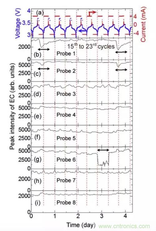 但是在循環(huán)30次以后,從1號(hào)光纖探測(cè)器到7號(hào)光纖探測(cè)器Li+濃度變化趨勢(shì)都變的一致,充電的時(shí)候濃度上升,放電的時(shí)候濃度下降,Toshiro Yamanaka認(rèn)為這主要是因?yàn)樵谘h(huán)30次后,負(fù)極的SEI膜的結(jié)構(gòu)和成分逐漸穩(wěn)定,從而電芯的各個(gè)部分之間離子阻抗趨于一致的結(jié)果。但是每個(gè)光纖探測(cè)器的變化趨勢(shì)也有所不同,例如3號(hào)和4號(hào)光纖探測(cè)器位置充放電過程中離子濃度的變化就比較小,2號(hào)光纖探測(cè)器處的離子濃度變化逐漸變小,而5號(hào)探測(cè)器位置的離子濃度變化則逐漸增大。這表明此時(shí)鋰離子電池內(nèi)部仍然存在著較大的不均勻性,例如4號(hào)位置離子濃度變化比較小,表明此處在充放電過程中的反應(yīng)速率較慢,引起局部SoC的不均勻,從而對(duì)電池的性能產(chǎn)生負(fù)面的影響。