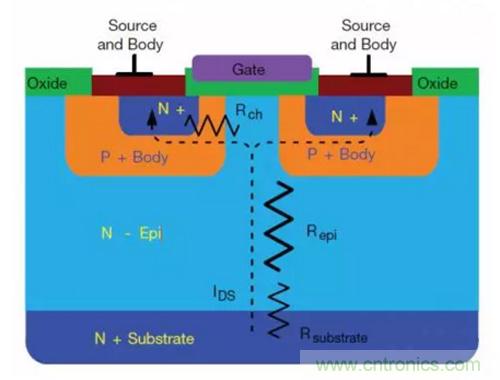 圖1顯示了一種傳統(tǒng)平面式高壓MOSFET的簡(jiǎn)單結(jié)構(gòu)。平面式MOSFET通常具有高單位芯片面積漏源導(dǎo)通電阻,并伴隨相對(duì)更高的漏源電阻。使用高單元密度和大管芯尺寸可實(shí)現(xiàn)較低的RDS(on)值。但大單元密度和管芯尺寸還伴隨高柵極和輸出電荷,這會(huì)增加開(kāi)關(guān)損耗和成本。另外還存在對(duì)于總硅片電阻能夠達(dá)到多低的限制。器件的總RDS(on)可表示為通道、epi和襯底三個(gè)分量之和: