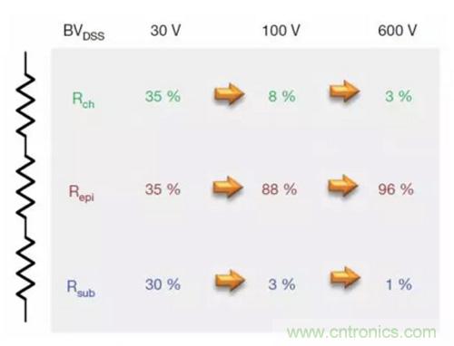 圖2顯示平面式MOSFET情況下構(gòu)成RDS(on) 的各個(gè)分量。對(duì)于低壓MOSFET,三個(gè)分量是相似的。但隨著額定電壓增加,外延層需要更厚和更輕摻雜,以阻斷高壓。額定電壓每增加一倍,維持相同的RDS(on)所需的面積就增加為原來(lái)的五倍以上。對(duì)于額定電壓為600V的MOSFET,超過(guò)95%的電阻來(lái)自外延層。顯然,要想顯著減小RDS(on)的值,就需要找到一種對(duì)漂移區(qū)進(jìn)行重?fù)诫s的方法,并大幅減小epi電阻。