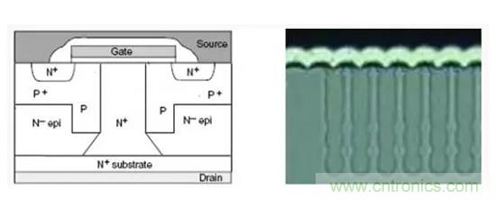 通常,高壓的功率MOSFET采用平面型結(jié)構(gòu),其中,厚的低摻雜的N-的外延層,即epi層,用來(lái)保證具有足夠的擊穿電壓,低摻雜的N-的epi層的尺寸越厚,耐壓的額定值越大,但是其導(dǎo)通電阻也急劇的增大。導(dǎo)通電阻隨電壓以2.4-2.6次方增長(zhǎng),這樣,就降低的電流的額定值。為了得到一定的導(dǎo)通電阻值,就必須增大硅片的面積,成本隨之增加。如果類(lèi)似于IGBT引入少數(shù)載流子導(dǎo)電,可以降低導(dǎo)通壓降,但是少數(shù)載流子的引入會(huì)降低工作的開(kāi)關(guān)頻率,并產(chǎn)生關(guān)斷的電流拖尾,從而增加開(kāi)關(guān)損耗。