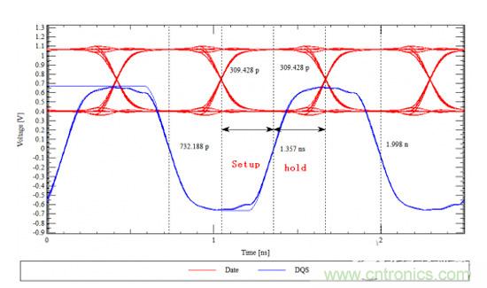 由上圖可知,在地址信號(hào)比時(shí)鐘信號(hào)長(zhǎng)的情況下,保持時(shí)間為684ps,建立越為1.1ns??梢?jiàn),相對(duì)于地址線與時(shí)鐘線等長(zhǎng)來(lái)說(shuō),地址線比時(shí)鐘線長(zhǎng)會(huì)使地址信號(hào)的建立時(shí)間更短。同理,如果時(shí)鐘線比地址線長(zhǎng),則建立時(shí)間會(huì)變長(zhǎng),而保持時(shí)間會(huì)變短。那么雙倍速率的數(shù)據(jù)信號(hào)又是怎樣的?下面通過(guò)具體的仿真實(shí)例來(lái)看一下。