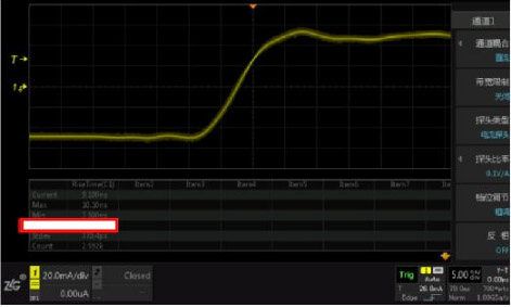 測(cè)試電流探頭的上升時(shí)間使用的測(cè)試儀器是信號(hào)發(fā)生器Keysight33600和示波器ZDS2022。信號(hào)發(fā)生器產(chǎn)生上升時(shí)間為5ns的方波,示波器顯示經(jīng)過(guò)電流探頭后的上升波形和時(shí)間。
