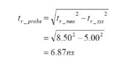 如圖3.1所示,根據(jù)示波器測(cè)量到的上升時(shí)間為8.5ns,這個(gè)總時(shí)間是信號(hào)發(fā)生器自身的上升時(shí)間加上探頭的上升時(shí)間,所以實(shí)際上探頭的上升時(shí)間還需要將總時(shí)間減去信號(hào)發(fā)生器自身的上升時(shí)間,具體的計(jì)算公式如下。