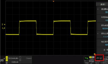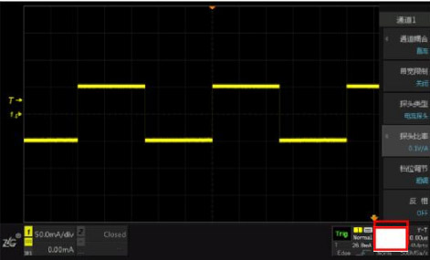 測(cè)試電流探頭的方波響應(yīng)時(shí),使用的測(cè)試儀器是信號(hào)發(fā)生器Keysight33600和示波器ZDS2022。信號(hào)發(fā)生器產(chǎn)生電流峰峰值為100mA,頻率分別1KHz、100KHz、1MHz為的方波,示波器顯示相對(duì)應(yīng)的方波波形。