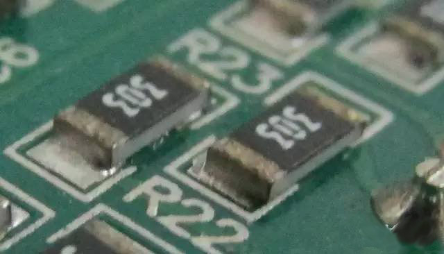 下圖是兩顆電極氧化了的貼片電阻(電極表面有點黑),別看它們現(xiàn)在好好的,一旦電路進入了惡劣的工作狀態(tài)(高溫高濕),電阻就會因為虛焊而使電路工作在不可預測的狀態(tài),繼而損壞。
