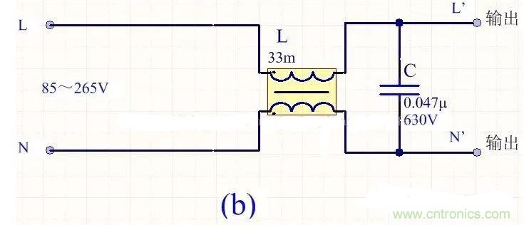 為降低成本和減小體積,開關(guān)電源一般采用簡(jiǎn)易的EMI濾波器,主要包括共模扼流圈L和濾波電容,以下四種可以根據(jù)情況進(jìn)行選擇: