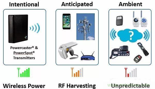 在壁櫥或梳妝臺(tái)抽屜中可以安裝類似手機(jī)發(fā)射器的小功率射頻發(fā)射器。這種發(fā)射器可以為可穿戴服裝提供充電區(qū)域。不管可穿戴設(shè)備是在壁櫥里還是在抽屜里,這些設(shè)備的電池都能自動(dòng)接收涓流充電。這種方法與接收器需要依賴一定頻率范圍內(nèi)的隨機(jī)射頻信號(hào)的場(chǎng)景不相干。圖9給出了射頻電源種類。