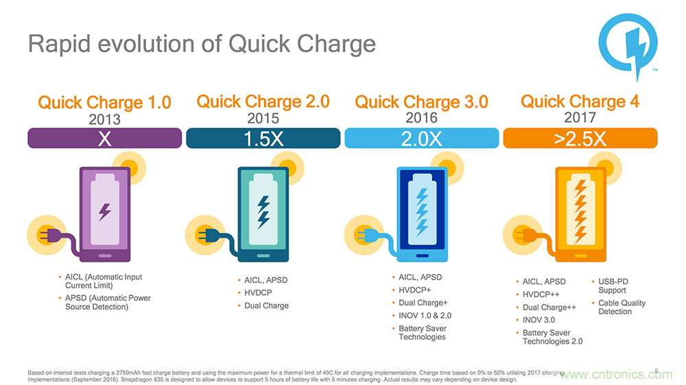 早在 2013 年,高通就意識到了“快充”對智能手機的重要性,當(dāng)時就推出了 Quick Charge 1.0 標準,通過提高輸入電流來提高充電效率,讓搭載驍龍 600 處理器的手機支持“5V 2A”充電。