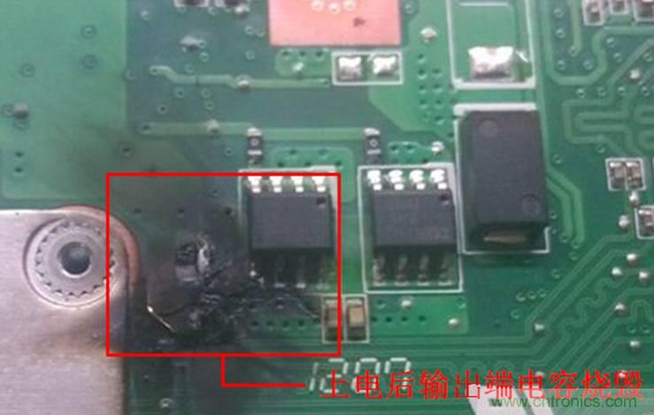 較于上一種電源模塊損壞的情況而言,更可怕的情況就是,不僅壞了電源甚至把整個電路都燒毀了。具體的現(xiàn)象就是電源模塊剛上電就燒毀冒煙了,輸入端的電容炸裂,如圖3所示,這一類問題是最為嚴重的,需要在前期設(shè)計中盡量避免,那么若是已經(jīng)發(fā)生了這一情況,它到底是什么原因?qū)е碌哪??具體如下所示: