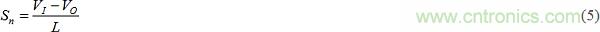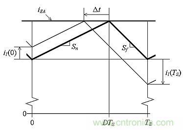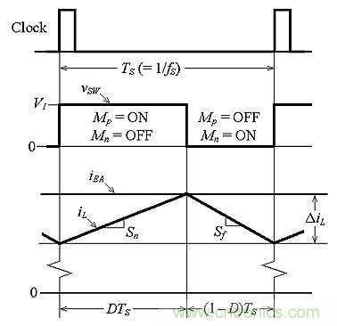 當(dāng)一個時鐘脈沖置位觸發(fā)器時,開始一個周期。這將關(guān)閉Mp開關(guān),使vSW=VI。在該周期的這一部分(在圖4中表示為DTS),電感器電流iL以斜率Sn上升,由iL-vL電感法則掌控,或Sn=diL/dt=vL/L。在這段時間,我們得到vL=VI– VO,所以: