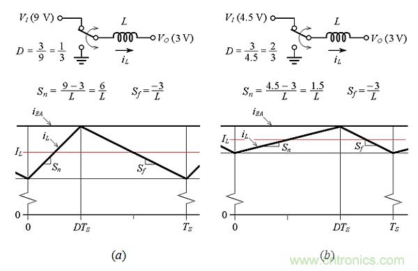 圖3所示電路存在兩個缺陷。第一個缺陷如圖5所示,是將VO調(diào)節(jié)為3.0V的轉(zhuǎn)換器設(shè)計(為簡單起見,假設(shè)周期在t = 0時開始)。圖4a示出了在VI=9V條件下,穩(wěn)態(tài)電感器電流iL和其平均值IL,對應(yīng)于D = 3/9 = 1/3的占空比。假設(shè)現(xiàn)在VI下降到4.5V,則對應(yīng)D = 3 / 4.5 = 2/3的占空比。假設(shè)vEA沒時間發(fā)生顯著變化,那么平均電感器電流iL將增加,如圖5b所示。這是因為當(dāng)下坡Sf在-3/L保持恒定時,上坡Sn從(9-3)/L減小到(4.5-3)/L,即從6/L減少到1.5/L。