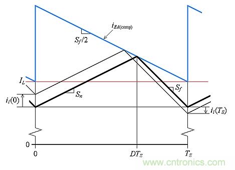 回來看圖5,我們觀察到,如果希望圖5b保持與圖5a相同的iL值,需要減小圖5b的iEA值,以便“下壓”iL波形,直到各IL對齊。那么, iEA需要減到多少呢?為了回答這個問題,需要畫出三個不同D值所需的iL波形。如圖7所示,我們從頂部繪制iL的下降斜坡開始,以相同的IL為垂直中心,并且全具有相同的斜率Sf=-VO/L。接下來,通過繪制上行斜坡來完成iL波形,如圖7底部所示。最后,將這三張圖疊加,如圖8所示,并觀察到峰值軌跡斜坡的斜率為Sf/2 = –VO/2L。