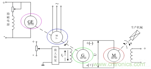 圖中,交流電動機(jī)(圖1中的藍(lán)色圈顯現(xiàn))為原動機(jī),工作時轉(zhuǎn)速基本恒定。由它拖動的直流發(fā)電機(jī)G(圖-1中的綠色圈顯現(xiàn)秒)給需要調(diào)速的直流電動機(jī)M(圖1中的紅色圈顯現(xiàn))的電樞供電。GE(圖1中的紫色圈顯現(xiàn))為一臺小型直流發(fā)電機(jī),可以如圖那樣與交流電動機(jī)、直流發(fā)電機(jī)G同軸相連,也可另設(shè)一臺小型交流電動機(jī)對其拖動。它在系統(tǒng)中的作用是提供一小容量的直流電源,供直流發(fā)電機(jī)G(圖1中的綠色圈顯現(xiàn))和直流電動機(jī)M(圖1中的紅色圈顯現(xiàn))的定子勵磁用,所以又稱GE為勵磁發(fā)電機(jī)。
