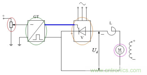 改變GT的輸入信號(圖2中的紅色圈顯現(xiàn))大小,就可改變其輸出脈沖(圖2中的藍(lán)色線條顯現(xiàn))的相位,不同相位的脈沖輸入整流器V,可以使整流器的輸出電壓Ud的大小發(fā)生變化,進(jìn)而改變電動機(jī)M的轉(zhuǎn)速。
