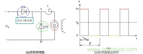 圖3中(a)圖為采用晶閘管做開關(guān)的直流斬波器—電動機(jī)調(diào)速系統(tǒng)原理圖。