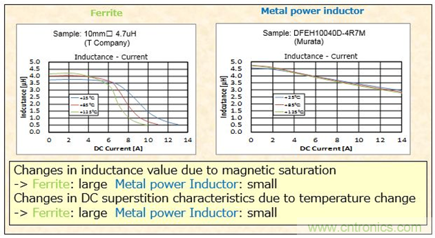 以村田公司生產(chǎn)的功率電感器為例,從產(chǎn)品工藝上可分為繞線電感和疊層電感,從材料上可分為金屬合金粉(一體成型)電感和鐵氧體電感。與鐵氧體電感相比,金屬合金電感有以下特點(diǎn):
