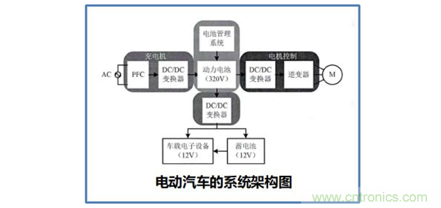 另一方面,DC/DC變換器可以將電動(dòng)機(jī)制動(dòng)剎車時(shí)由機(jī)械能轉(zhuǎn)化而來(lái)的電能回饋給蓄電池組,其效率高達(dá)85%~95%,遠(yuǎn)大于發(fā)電機(jī)的正常效率。以可控的方式給蓄電池組充電,尤其是在電動(dòng)汽車需要頻繁啟動(dòng)和制動(dòng)的城市工況運(yùn)行條件下,可以有效地回收制動(dòng)能量,增加電動(dòng)汽車的行駛里程。因此,電動(dòng)汽車采用DC/DC變換器可以優(yōu)化電動(dòng)機(jī)控制、提高電動(dòng)汽車的整體效率和性能。下圖為電動(dòng)汽車的系統(tǒng)架構(gòu)圖。