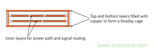 b.PCB 的頂層和底層布局帶有屏蔽接地區(qū)域,利用一個(gè)過孔將其連接起來,以模擬法拉第籠。所有高 di/dt 環(huán)路布置在 PCB 的內(nèi)層,所以法拉第籠就能夠屏蔽電磁場, 防止向外輻射。該方法成本較低,通常足以抑制 EMI。圖 10 為該技術(shù)的示意圖。