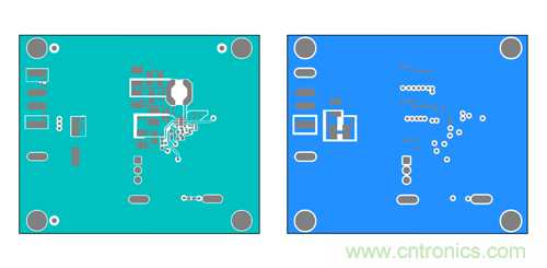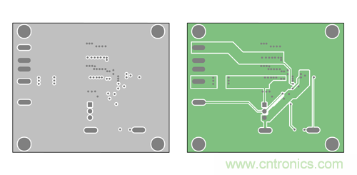 現(xiàn)在,我們以 Maxim 的喜馬拉雅 MAX17502 寬輸入范圍 IC 為例,器件工作在 4.5-60Vin、0.9- 54Vout,提供 1A 負(fù)載電流。以下為 MAX17502 EMI 評估板 PCB 的布局,采用了法拉第屏蔽技術(shù) (b)。圖 11a 所示為頂層和底層,用作法拉第屏蔽;圖 11b 所示為內(nèi)部第二層和第三層,用于布線。這里的第二層用作額外屏蔽,也可用于布線。該布局中,高 di/dt 電流環(huán)路 I1 和 I2 布置在第三層, 被完整籠罩在法拉第屏蔽中。