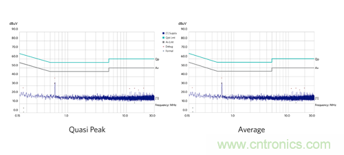 圖 12:MAX17502 EMI 評估板傳導(dǎo) EMI 測試結(jié)果。左:準(zhǔn)峰值;右:平均值。