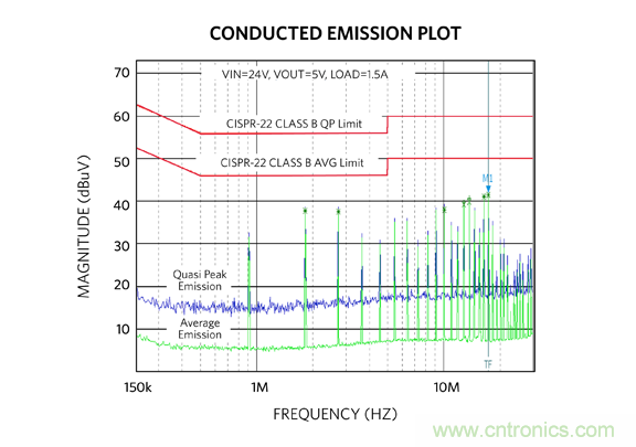 圖 15:MAXM17575 評估板傳導(dǎo) EMI 測試結(jié)果。藍(lán)色:準(zhǔn)峰值;綠色:平均值