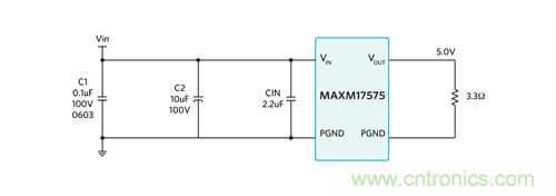 例:以 Maxim 的喜馬拉雅 SiP 電源模塊 MAXM17575 為例,器件采用 4.5-60Vin、0.9-12Vout,提供最大 1.5A 電流。以 MAXM17575 評估板為例,最小輸入電壓為 7.5V。輸出負(fù)載為 RO = Vo/Io = 5V/1.5A =3.3?。最大工作占空比為 D = VO/VINmin = 5V/7.5V = 0.66。所以,最低可能輸入阻抗為 RIN = RO/D2 = 3.3 ?/0.662 = 7.6?。