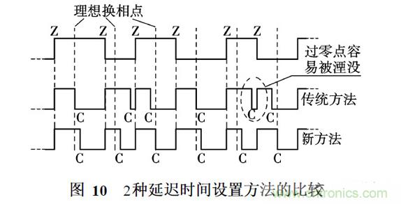 當(dāng)三相反電動勢波形的間隔時間長度不是理圖11 新的延遲時間設(shè)置方法想的120°電角度,過零點間隔時間不相等時,采用新的延遲時間設(shè)置方法可以使換相更為準(zhǔn)確,換相點落在前后2個過零點的中間位置,過零點不容易被湮沒,電機運行不易失步,如圖10所示. 特別是在電機高速運行時,新方法提高了電機運行的可靠性,實驗很好地驗證了新方法的可行性和有效性.
