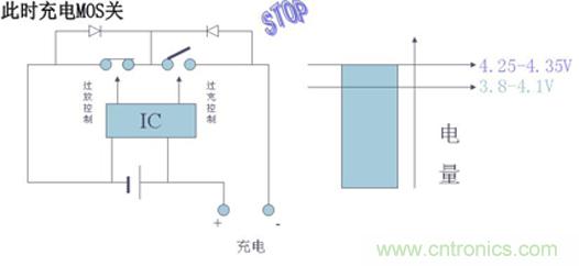 電池在被充電過(guò)程中,如果充電器電路失去控制,會(huì)使電池電壓超過(guò)4.2V后繼續(xù)恒流充電,此時(shí)電池電壓仍會(huì)繼續(xù)上升,當(dāng)電池電壓被充電至超過(guò)4.3V時(shí),電池的化學(xué)副反應(yīng)將加劇,會(huì)導(dǎo)致電池?fù)p壞或出現(xiàn)安全問(wèn)題。