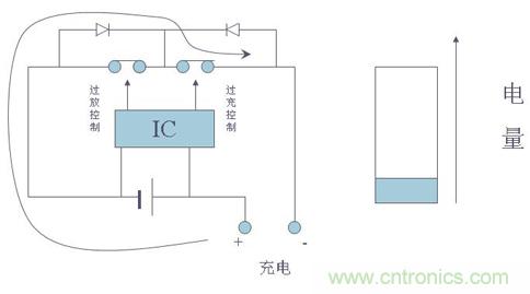 在帶有保護(hù)電路的電池中,當(dāng)控制IC檢測(cè)到電池電壓達(dá)到4.28V(該值由控制IC決定,不同的IC有不同的值)時(shí),其“CO”腳將由高電壓轉(zhuǎn)變?yōu)榱汶妷海筎1由導(dǎo)通轉(zhuǎn)為關(guān)斷,從而切斷了充電回路,使充電器無(wú)法再對(duì)電池進(jìn)行充電,起到過(guò)充電保護(hù)作用。而此時(shí)由于T1自帶的體二極管VD1的存在,電池可以通過(guò)該二極管對(duì)外部負(fù)載進(jìn)行放電。
