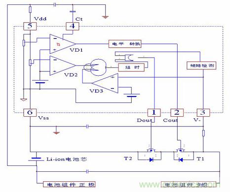 當(dāng)電池電壓因放電而降低至設(shè)定值VD(2.3-2.5V)時(shí), VD2翻轉(zhuǎn),以IC內(nèi)部固定的短時(shí)間延時(shí)后,使Dout變?yōu)榈碗娖?,T2截止,放電停止。