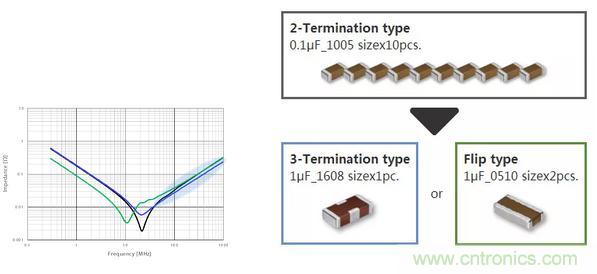 為了抑制電壓波動,需要降低阻抗。此處將介紹為了在基板尺寸以及貼裝區(qū)域等受到嚴格限制的情況下實現所需要的阻抗特性,TDK所提出的通過替換為低ESL產品來減少去耦電容數量的方案。