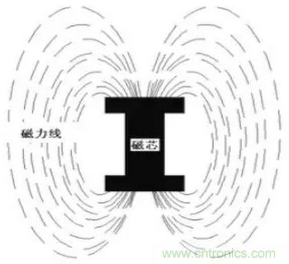 正如上所指,對于一個(gè)開環(huán)磁路的電感(以工字電感為例),其磁力線的主磁路是空氣。如圖1。