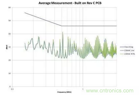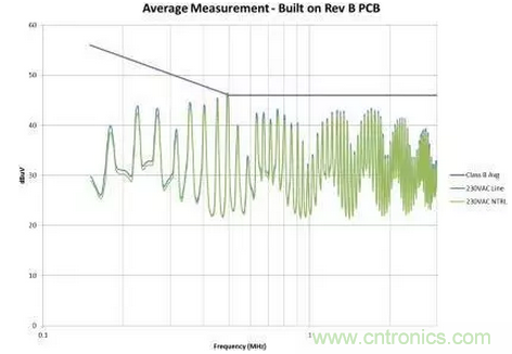 圖4是修改后的效果圖。我們在故障點(diǎn)位置為EMI規(guī)范獲得了大約6dB的裕量。此外,我們還顯著減少了總體EMI簽名。所有這些改善都僅僅是因?yàn)椴季值恼{(diào)整,并未改變電路。如果您的電路具有高電壓開關(guān)并使用了屏蔽距離,您需要非常小心地對其進(jìn)行控制。