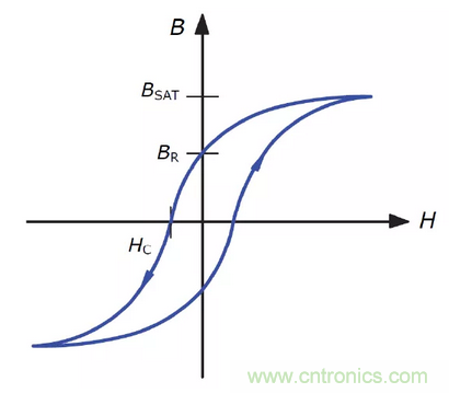 一般高頻電感所用的鐵氧體鐵芯是含有鎳鋅或錳鋅之鐵氧體化合物,屬于矯頑磁力低的軟磁類鐵磁材料。圖1為一般磁鐵芯之磁滯曲線,磁性材料的矯頑磁力HC亦稱為保磁力,系指當(dāng)磁性材料已磁化到磁飽和后,使其磁化強(qiáng)度減為零時所需的磁場強(qiáng)度。矯頑力較低代表抵抗退磁能力較低,也意味著磁滯損失較小。