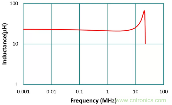 電感器之電感值在電路設(shè)計時為最重要的基本參數(shù),但必須看在工作頻率下此電感值是否穩(wěn)定。電感的標(biāo)稱值通常是在沒有外加直流偏置的條件下,以100 kHz 或1 MHz 所量得。且為確保大量自動化生產(chǎn)的可能性,電感之容差值(tolerance)通常是 ±20%(M)與±30%(N)居多。圖3為利用表量測 電感220M 之電感-頻率特性圖,如圖所示,在5 MHz 之前電感值的曲線較為平坦,電感值幾乎可視為常數(shù)。在高頻段因寄生電容與電感所產(chǎn)生的諧振,電感值會上升,此諧振頻率稱為自我諧振頻率,通常需遠(yuǎn)高于工作頻率。