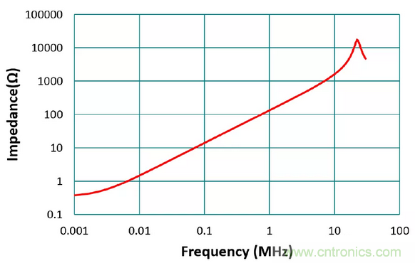 如圖4,從阻抗圖也可以看出電感在不同頻率下的表現(xiàn)。電感的阻抗約與頻率成正比(Z=2πfL),因此頻率愈高,電抗會比交流電阻大很多,所以阻抗表現(xiàn)就如同純電感(相位為90?)。而再往高頻,由于寄生電容效應(yīng),可以看到阻抗的自我諧振頻率點,過了此點阻抗下降呈現(xiàn)電容性,且相位逐漸轉(zhuǎn)為-90 ?。